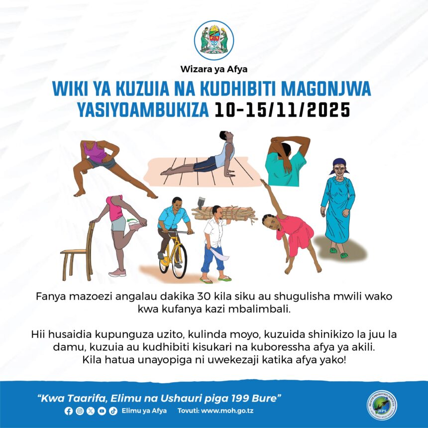 Kwa mujibu wa Mkuu wa Kitengo cha Mawasiliano serikalini Roida Andusamile wiki ya magonjwa yasiyoambukiza (NCDs) huadhimishwa wiki ya pili ya Oktoba kila mwaka.